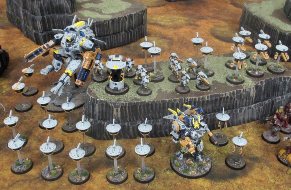 Son of STILL MORE T'au. Other Tim and I faced these in the last round. It included a Cadre Fireblade and a Commander in an XV86 Coldstar Battlesuit, A unit of Kroot and two Fire Warrior Strike Teams, a unit of XV8 Crisis Battlesuits, a unit of Vespids, a unit of XV** Broadside Battlesuits and a pile of Drones.