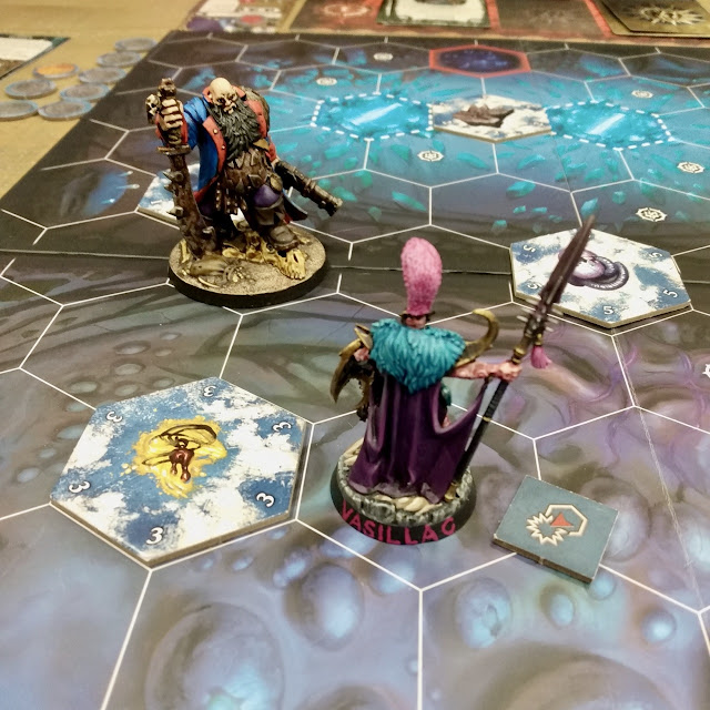 All set up for Game Two. Amanda chose the Profane Larder board, which I'd used in the previous game. Initially she'd takend the Chamber of Genesis board (or maybe the Hall of Sublimination...?) - one of the two boards in the Harrowdeep/Nethermaze set that didn't have a hazard hex - which I pointed out she might want if she's ONE wound away from inspiring, sometimes it might be worth it to run through one just to inspire the warband, so she switched and took the Profane Larder which had one close to one of the board edges. I chose second, so I took the n the Chamber of Genesis Board and oriented it so that hazard hex was at the back of her territory and not of much use to her...